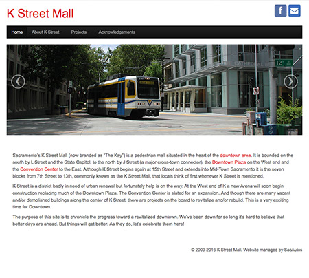 K Street Mall is an advocate website for improving the downtown Sacramento corridor. This project consists of a social media site (facebook.com/kstreetmallsac) for daily events and a WordPress website for the “big picture” perspective.