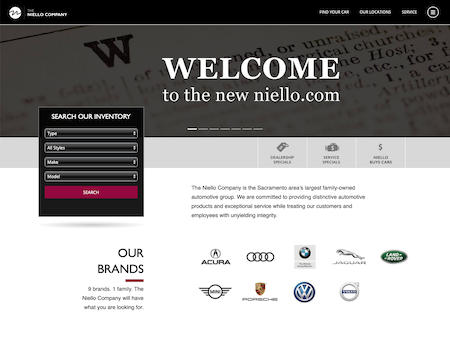 The Niello Company is a Sacramento California auto dealership chain that specializes in luxury imports. We provide the cloud hosting for the primary dealership website as well as most of the individual brand sites, domain and DNS administration, email filtering and hosting, a custom Content Management System, and much, much more.